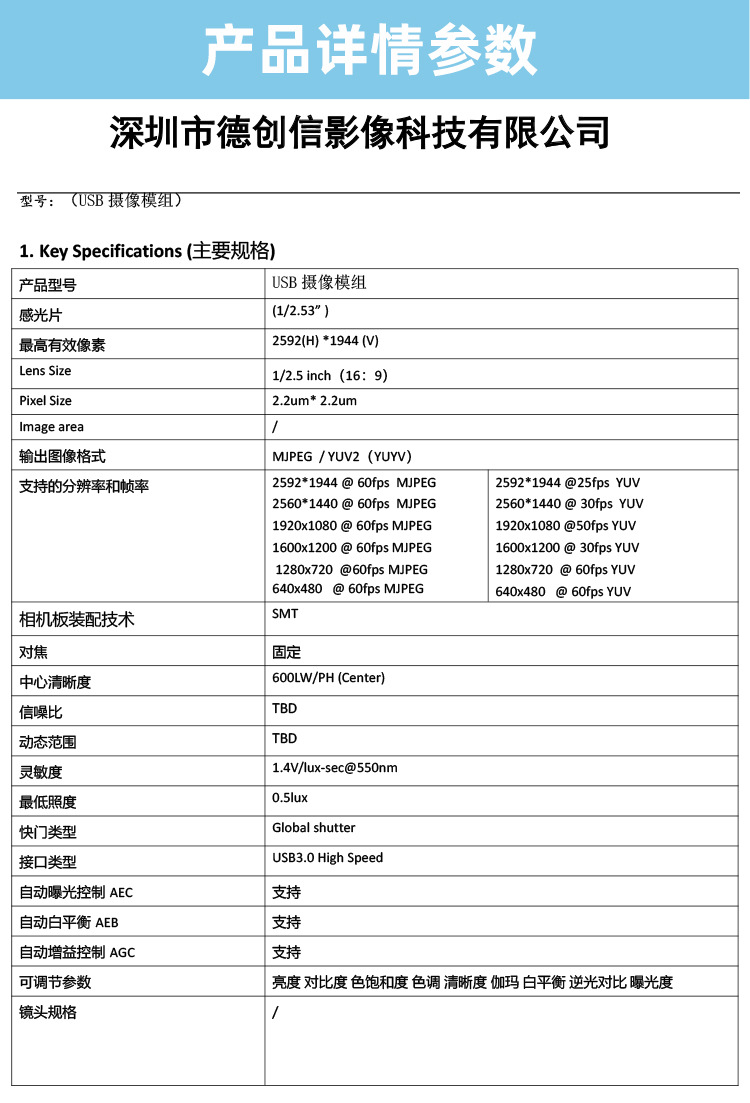 | 最高分辨率 | 2592*1944 | 帧速 | 60FPS |